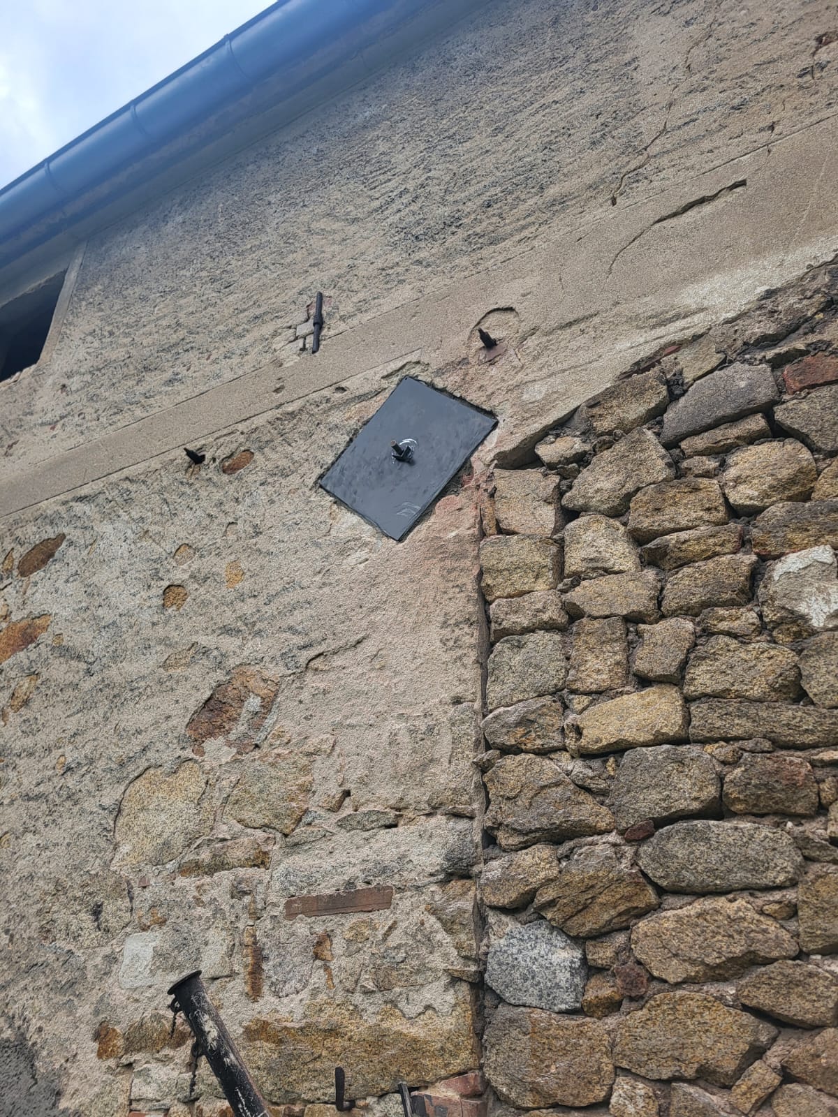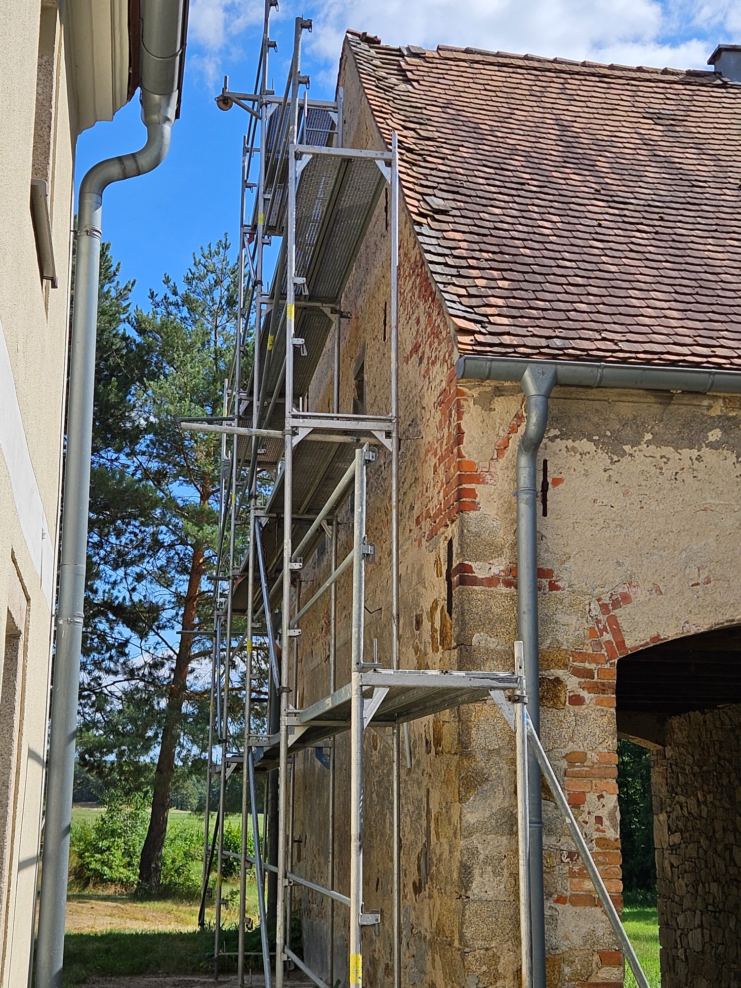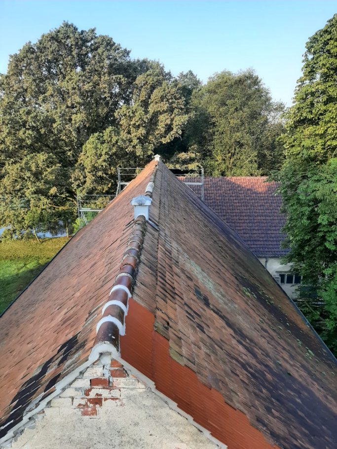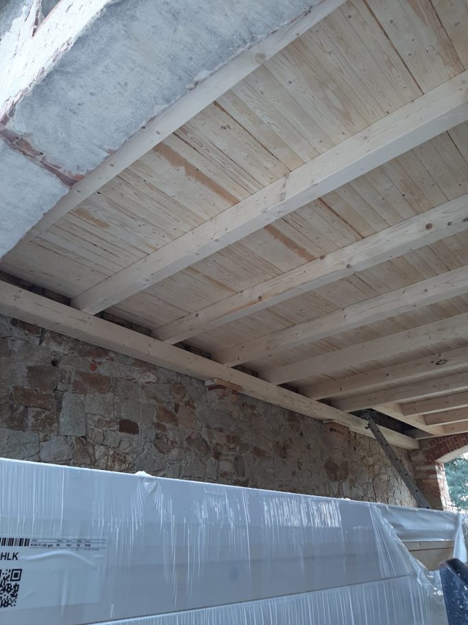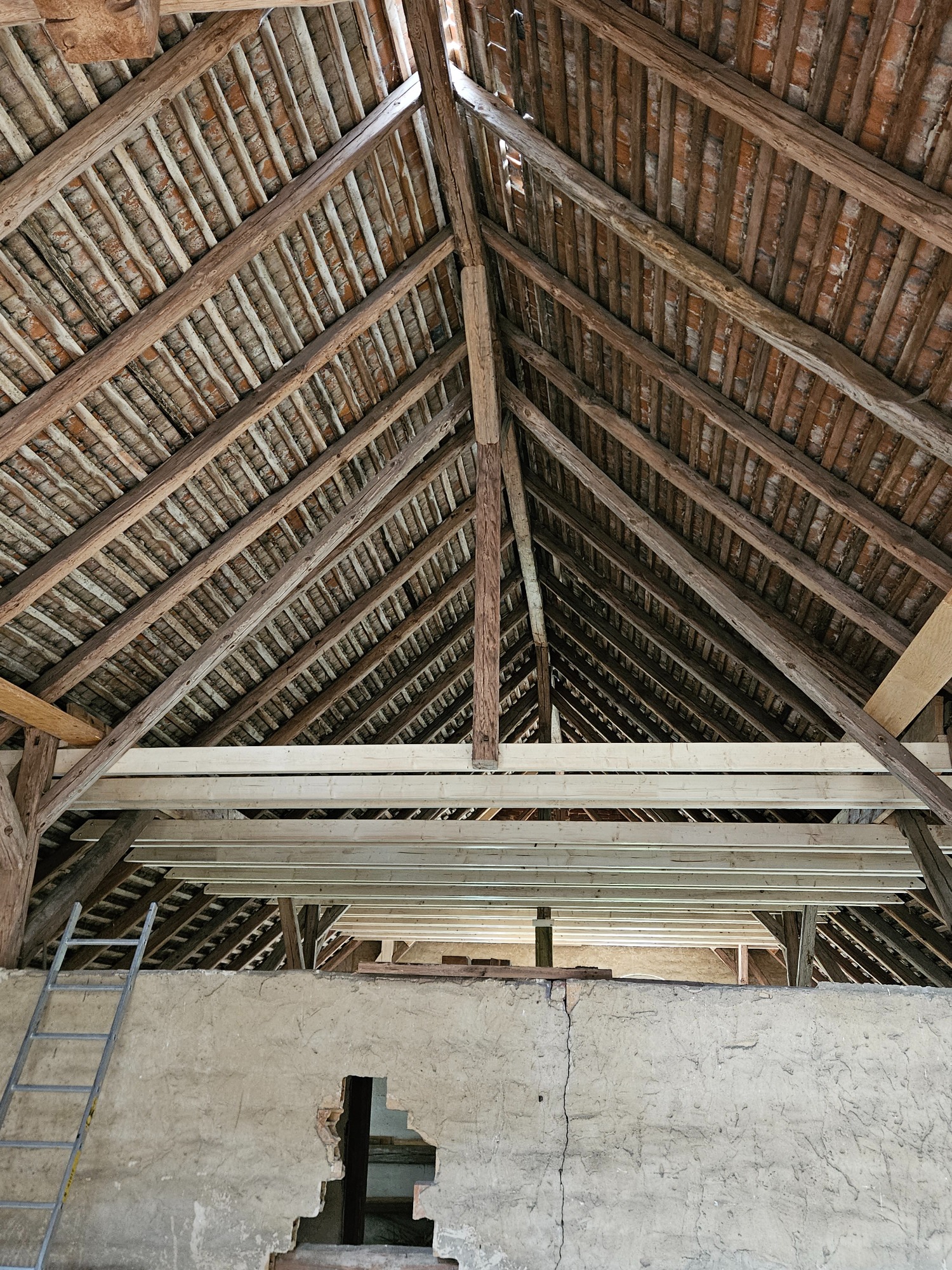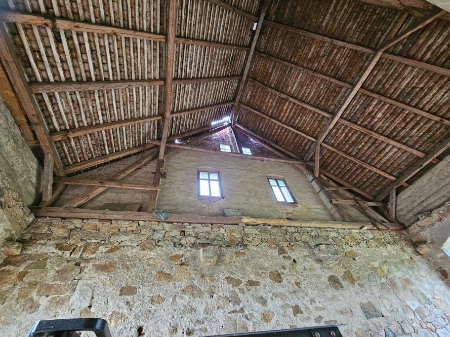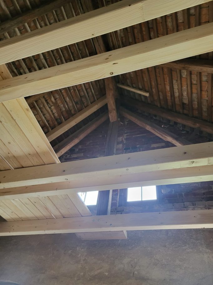 Das Dach des Pferdestallen war an einigen Stellen bereits so löchrig, das ungehindert das Wetter eindringend konnte. Beide Giebel waren kurz vor dem Einsturz und ein wichtiger Tragebalken war gebrochen und das gesamte Dach an einer Seite um 20cm bereits nach unten gesackt. Dies bedeutete das eine richtige Beule im Mauerwerk entstand und jederzeit nach außen hätte stürzen können und das wäre das Ende unseres Pferdestall gewesen.
