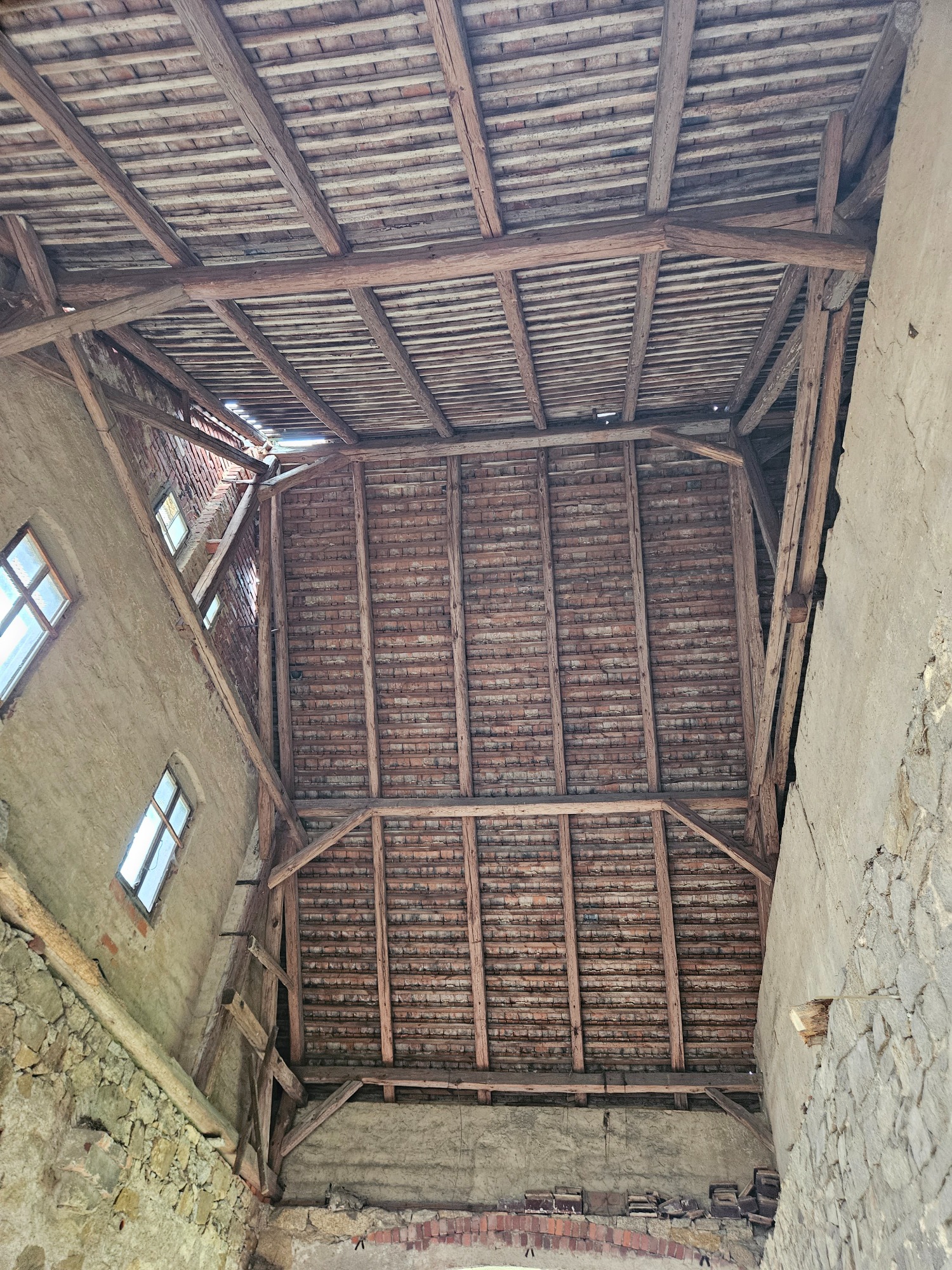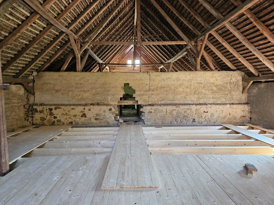 In einer Hälfte gab es keine Zwischendecke und man konnte vom Fußboden bis an die höchste Dachziegel schauen. Auf der anderen Seite waren noch zwei Kutscherstuben schemenhaft zu entdecken. Die Zwischendecken waren eingestürzt, die Treppe nach oben nur noch zur Hälfte vorhanden.